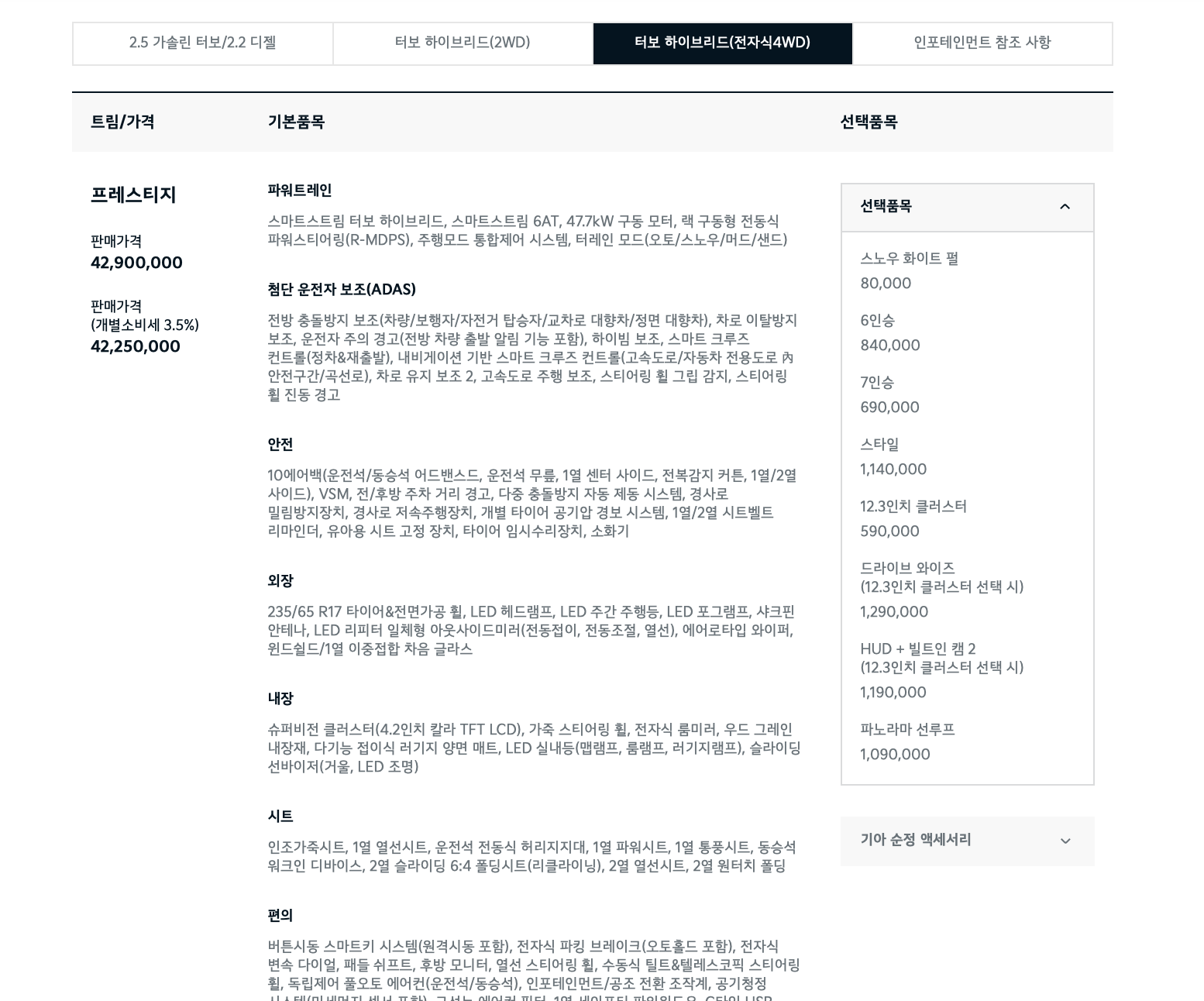 - 1.6 가솔린 터보 하이브리드: 약 235마력, 복합연비 15.7km/L 예상