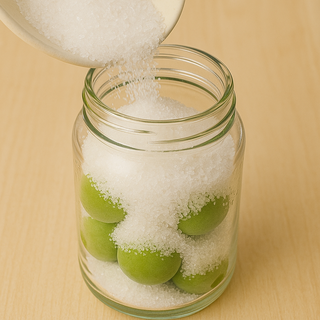 - 병 바닥부터 매실 → 설탕 → 매실 → 설탕 순으로 층층이 쌓아줍니다.